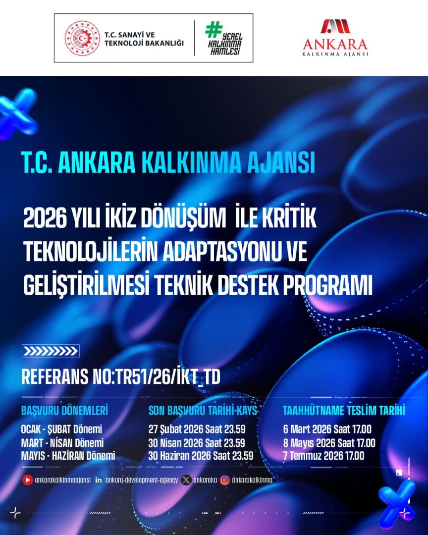 İkiz Dönüşüm İle Kritik Teknolojilerin Adaptasyonu ve Geliştirilmesi Teknik Destek Programı (2026) Ankara Kalkınma Ajansı, sanayi ve hizmet sektörlerinde faaliyet gösteren
